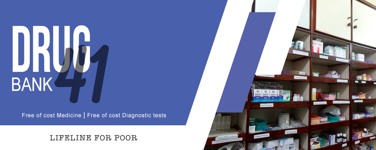 Drug Bank 41 is at Abbasi Shaheed Hospital which caters to the needs of the Zakat deserving inpatients of the hospital by providing them Free of cost medicine, medical & surgical supplies, radiological services & laboratory diagnostic tests and blood & blood related products.
